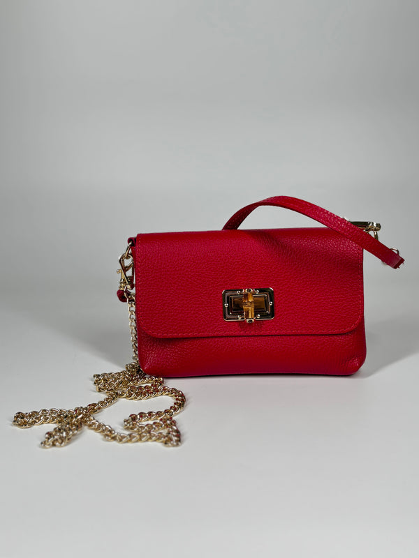 Mini Bag in Pelle Martellata con Chiusura Bamboo - Rossa