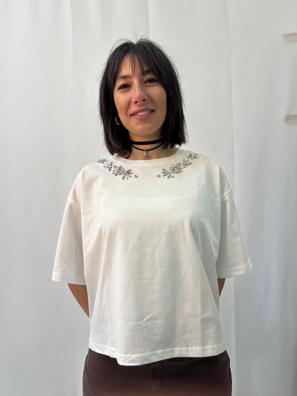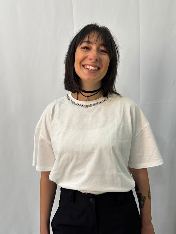 T-shirt Zahjr Oversize con Girocollo e applicazione strass - Bianco