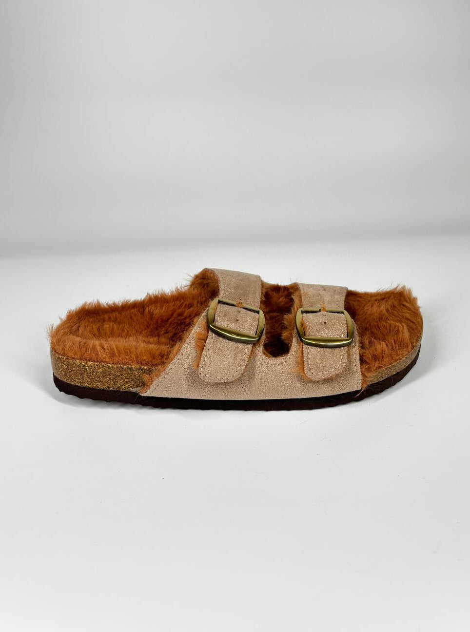 Ciabatte Mules Pelose con Doppia Fibbia - Beige